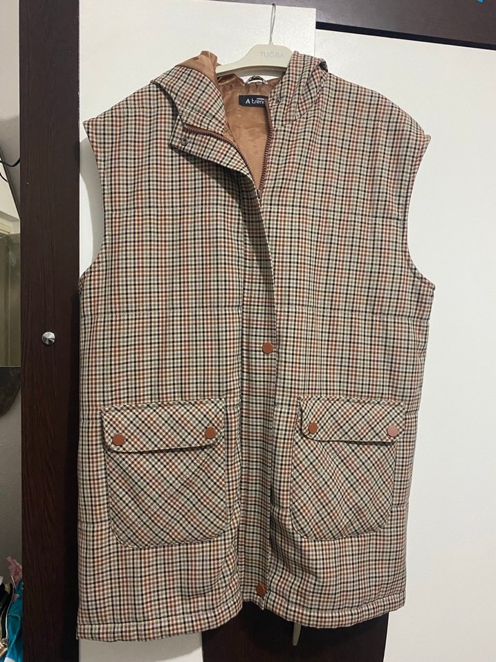 Kahverengi kareli, düğmeli, yakalı ve kolsuz kadın yeleği. Sentetik kumaştan, normal kesim ve midi boyda, günlük rahat kullanım için uygun. 1 kere giyildi , 1650 alındı
