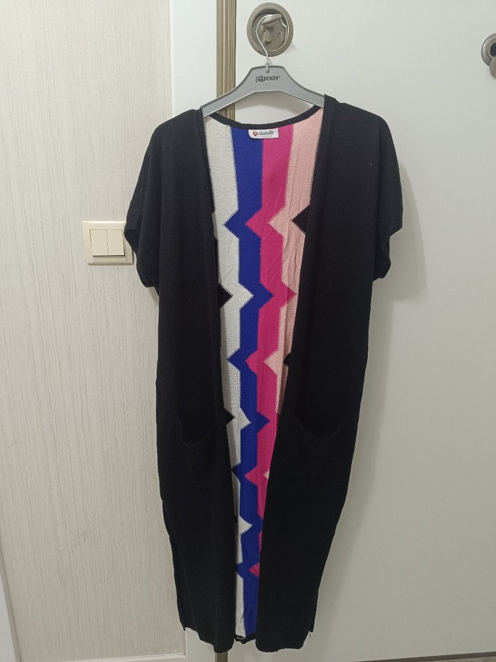 Uzun kesim, bol fitli triko elbise, önünde canlı çok renkli zikzak desen, kısa kollu, V yakalı ve yan yırtmaçlıdır. Sokak modasına uygundur. az kullanildi