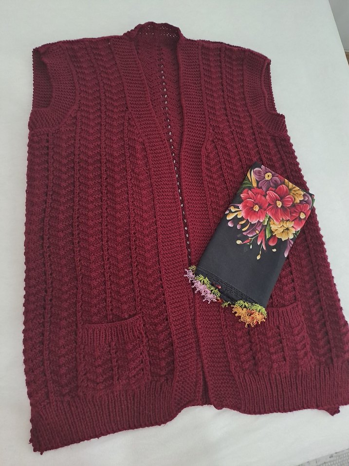 Bordo renkli, örgü örme, kolsuz kadın yelek el emeyi yanında yazmayla takim şeklinde tanesi 2500 tl