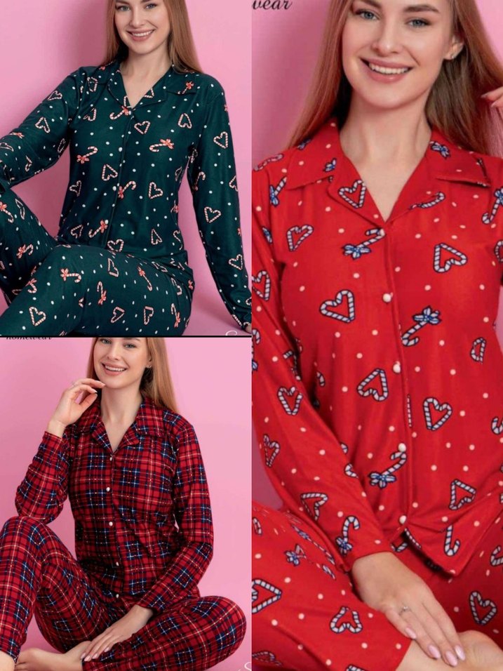 Rahat kesim, uzun kollu kadın pijama takımları, renkli ve desenli tasarımlara sahip. yeni yıl temalı marka temsilidir beden ve renk sorunuz yeni ilan açtırınız tek takım fiyatıdır