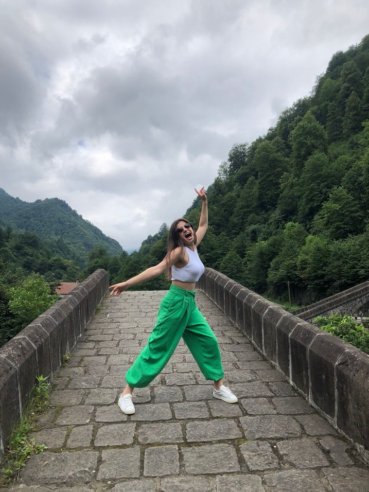 Hafif yeşil bağcıklı, pamuklu, salaş kesim kadın eşofman, tie-dye desenli ve kabarık detaylı, outdoor sokak stili için uygun.