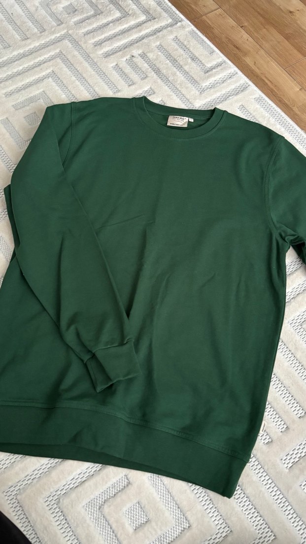 Kadın sweatshirt, yuvarlak yaka ve uzun kolludur. Rahat kesimi ve yumuşak, sıcak kumaşıyla koyu yeşil renkte, desensizdir ve günlük kullanım için uygundur.
