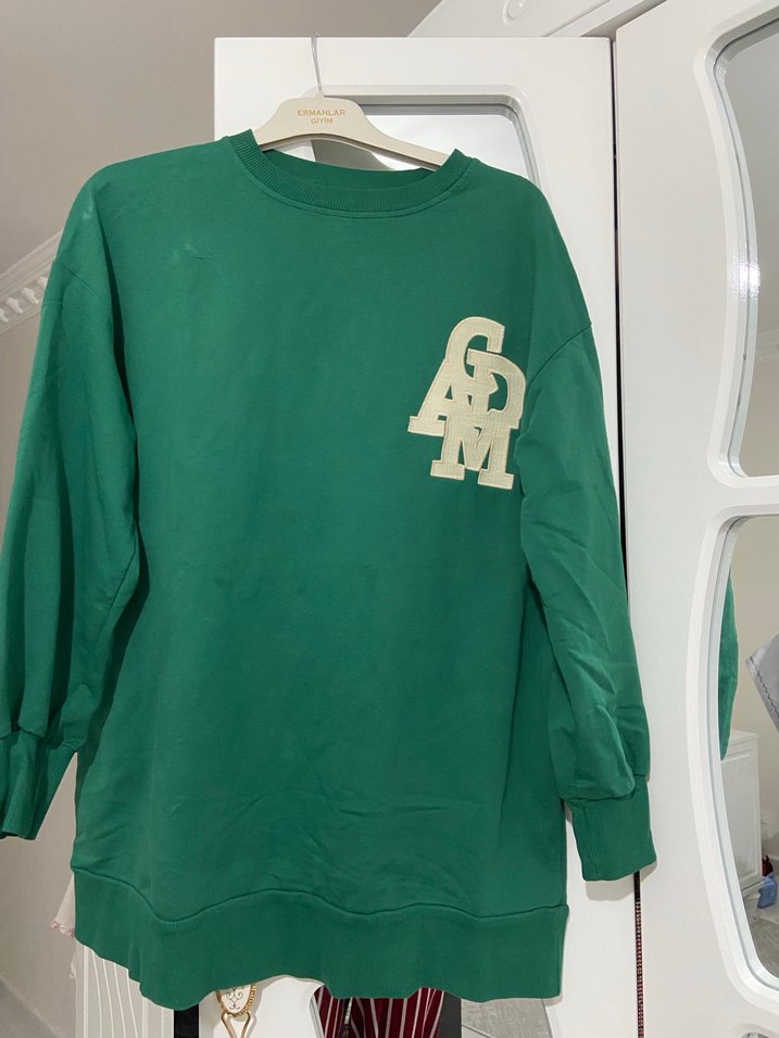 Uzun kollu, yuvarlak yaka, baskılı desenli yeşil oversize sweatshirt. Yumuşak ve sıcak kumaştan, günlük kullanıma uygun.