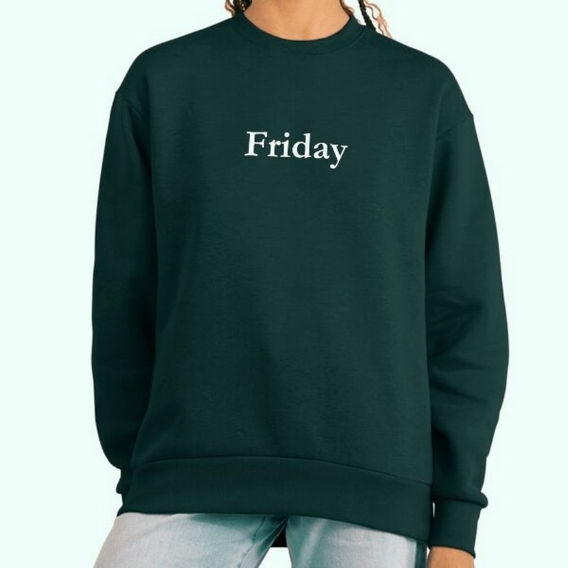 Kadınlar için koyu yeşil, yuvarlak yaka ve uzun kollu, bol kesim sweatshirt. Önünde "Friday" baskısı bulunur. Yumuşak ve sıcak kumaştan üretilmiştir.