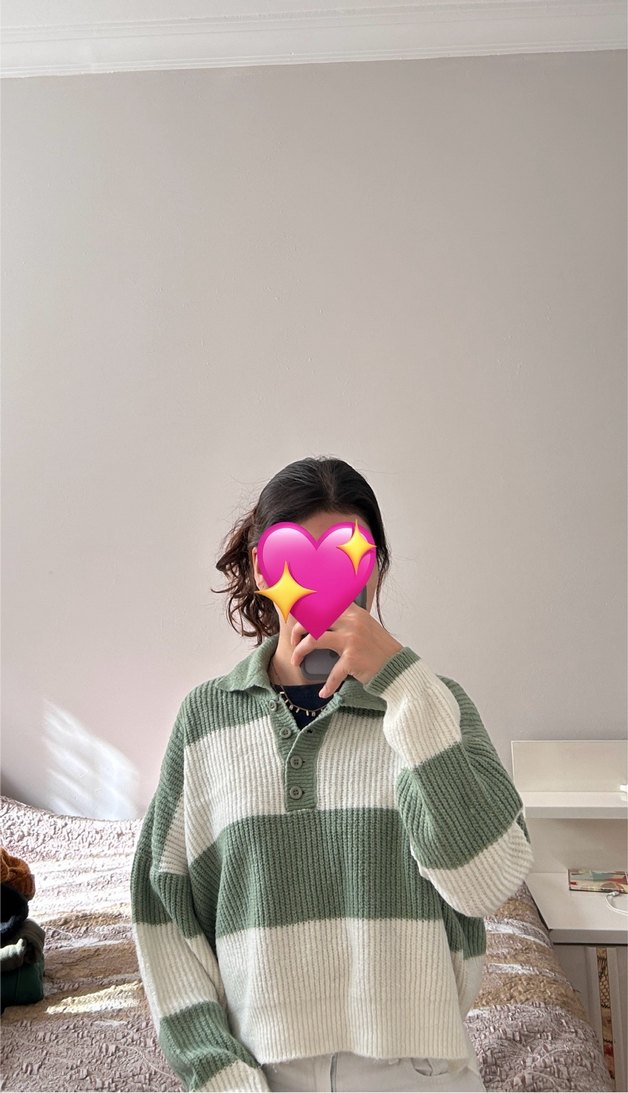 Bu örgü kazak, uzun kollu ve bol kesim olup, geniş yeşil ve beyaz çizgilerle günlük rahat bir stil sunar.