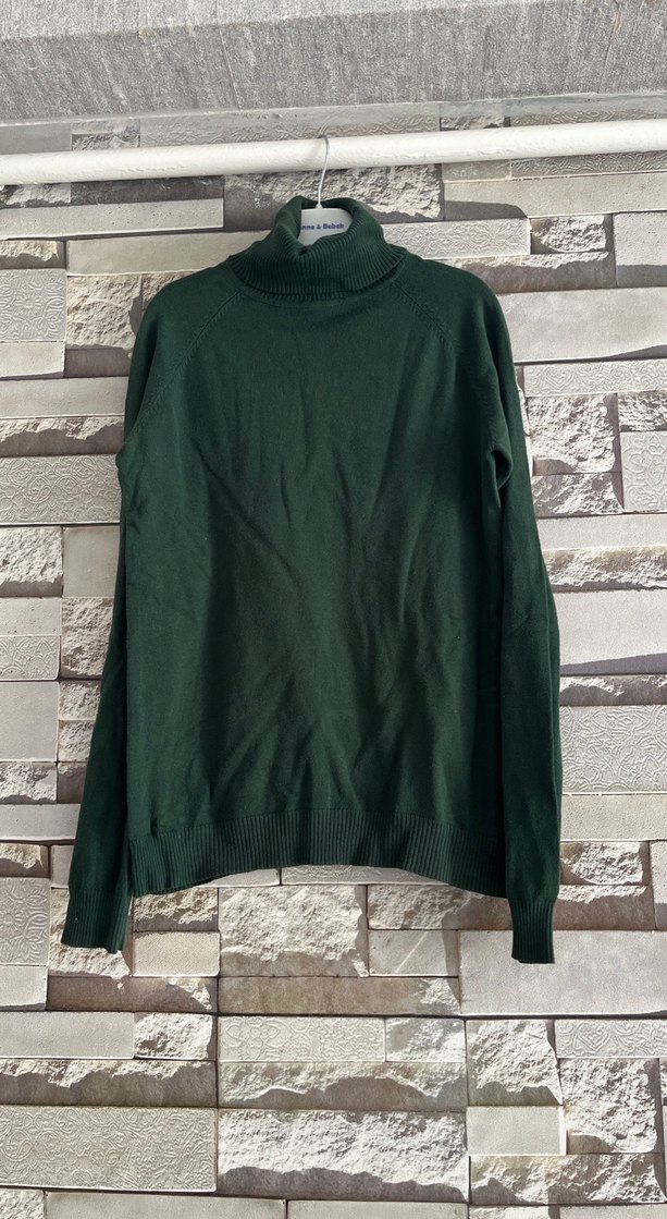 Kadınlar için koyu yeşil renkte, boğazlı ve uzun kollu örgü kazak. Rahat kalıp ve sentetik yumuşak kumaştan, gündelik ve sokak stili için uygun.
