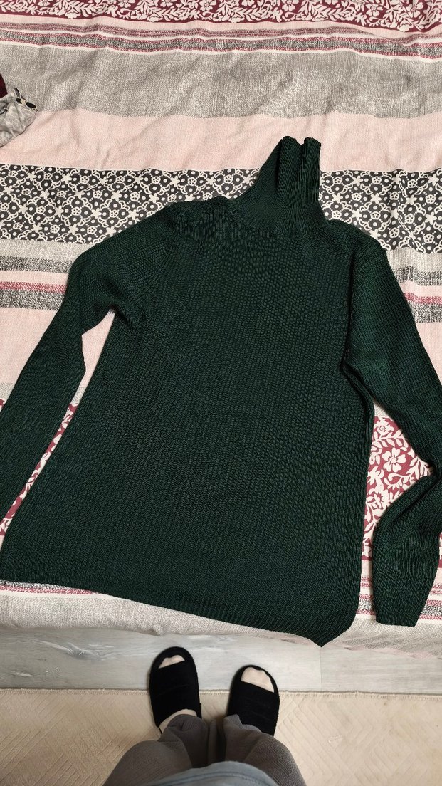 Kadınlar için koyu yeşil, boğazlı ve uzun kollu triko kazak. İnce dokusu ve sade tasarımıyla günlük kullanıma uygundur.