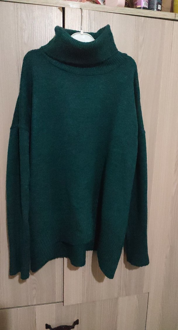 Koyu yeşil renkte kadın triko kazak, boğazlı yakalı ve örgü dokusuna sahiptir. Uzun kollu, midi boy ve bol kesimdir, günlük kullanıma uygundur.