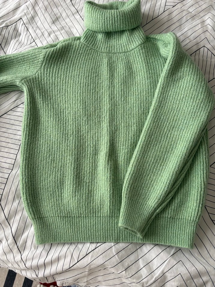 Pastel yeşil renkte, boğazlı ve uzun kollu örme triko kazak. Salaş kesimi ve desensiz sade tasarımıyla günlük kullanıma uygun.