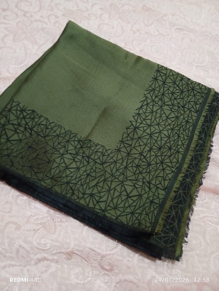 Koyu haki renkte, siyah desenli, drapeli tasarıma sahip kadın esarp. Yumuşak sentetik kumaştan, bohem ve rahat bir stil sunar. sadece bir Kere kullandim