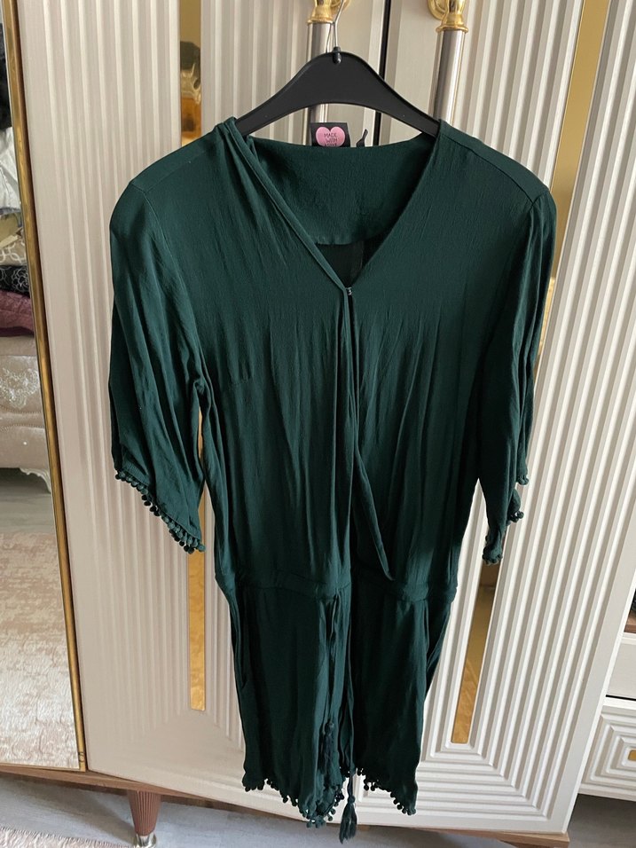 Kadın yeşil tulum, bol kesim ve V yaka ile drapeli tasarıma sahip. Kısa kollu ve ipeksi dokulu, bohem tarz için uygundur.