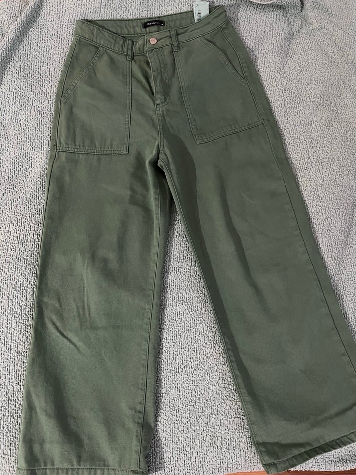 Wide leg denen model rengi yeşil, ilk fotoğraftakinden daha canlı. Aklınıza takılan olursa yazabilirsiniz. Çok heves ederek almıştım boyuma göre de kestirdim (1.60) ama sonra neredeyse hiç giymedim.