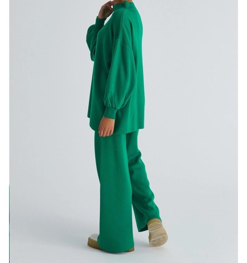 Kadınlar için yeşil, bol kesim, uzun kollu ve bisiklet yaka eşofman takımı. Yumuşak ve sıcak kumaştan üretilmiştir, günlük rahat kullanım için ideal.