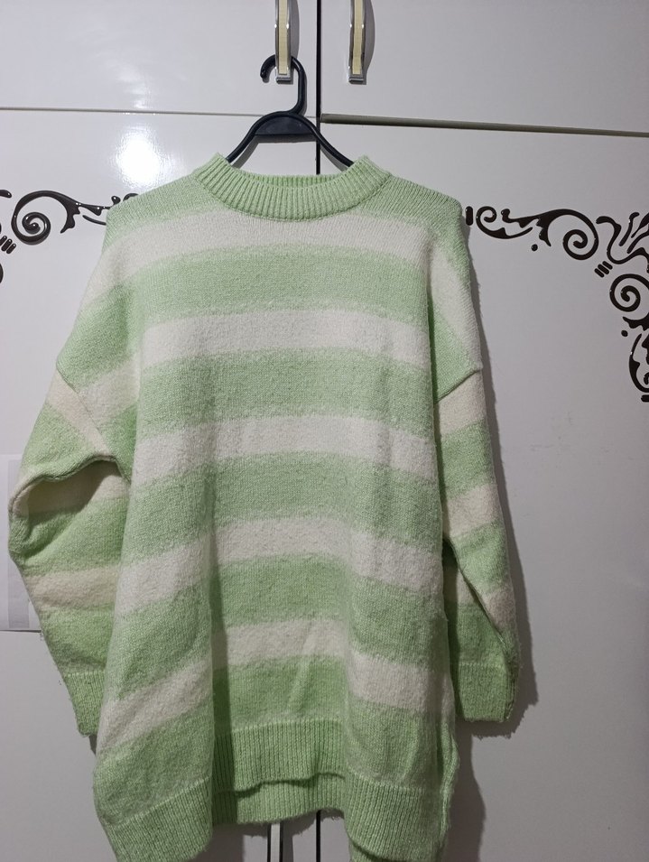 Kadınlar için gevşek kesim, uzun kollu ve yuvarlak yakalı örgü kazak. Pastel yeşil ve beyaz çizgili, rahat ve şık sokak stiline uygun.
