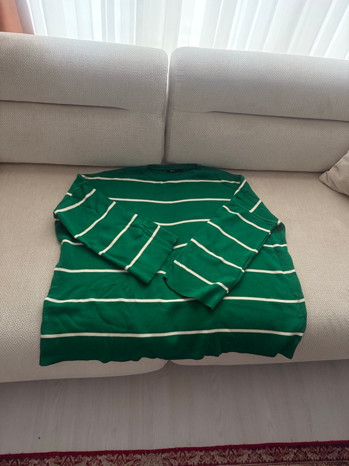 Beyaz çizgili, uzun kollu, yeşil triko, tekne yaka ve dar kesim. Rahat sokak stili için uygun.