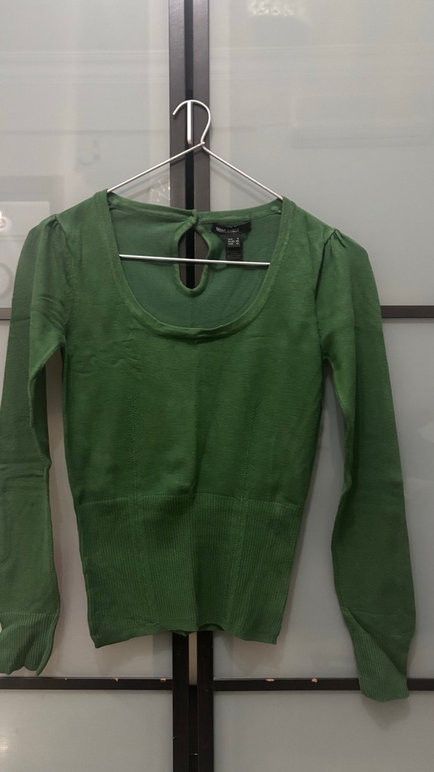 Bu yeşil dar kesim kazak, yuvarlak yaka ve uzun kolludur. Yumuşak sentetik kumaştan üretilmiş olup günlük sokak stili için uygundur.