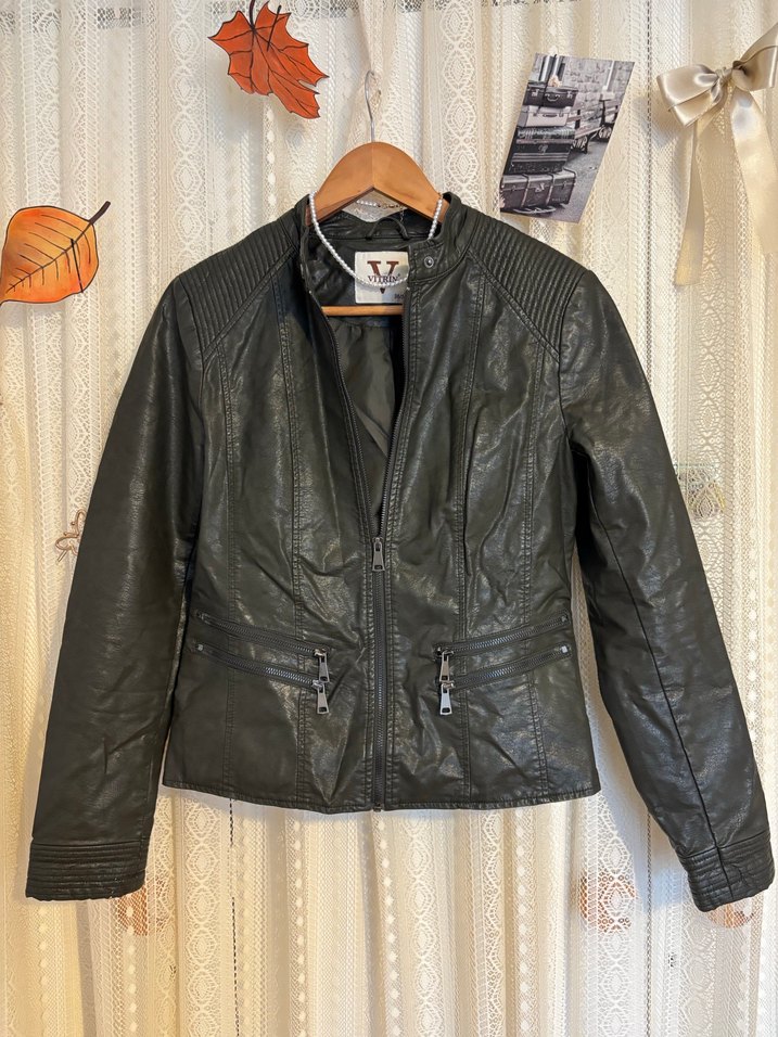 Koyu Yeşil, dar kesim deri biker ceket, uzun kollu ve tokalı detaylara sahip, yakası kesik ve normal boyda, günlük kullanıma uygun. Vitrin Marka 36/S beden. Az kullanıldı.