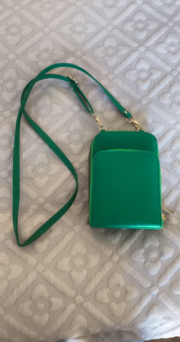 Parlak yeşil deri çapraz çanta, fermuarlı ve ayarlanabilir askılı, düz tasarımlı, sokak stiline uygun. Günlük kullanıma uygun.