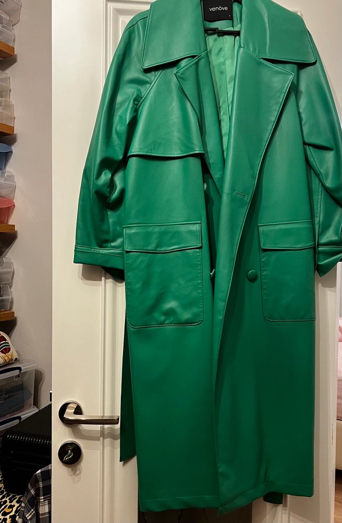 Kadınlar için uzun kesim, parlak yeşil deri trençkot. Kuşaklı, yakası kesik ve kolları askılı. Ofis ve sokak modasına uygun, rahat kesim.