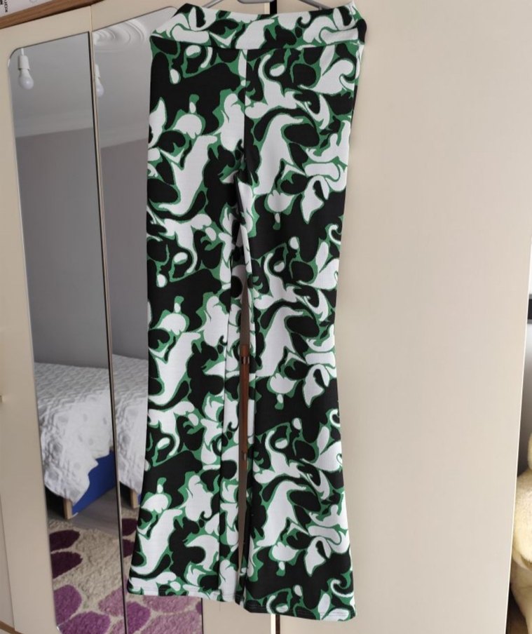 Kadınlar için yeşil tonlarında bağlama desenli, drapeli, sentetik kumaştan uzun ve dar kesim pantolon, sokak modasına uygun.