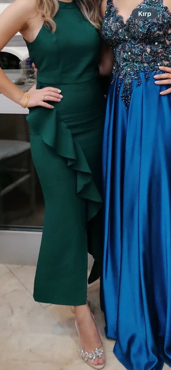 Bu yeşil uzun elbise, straplez ve drapeli detaylara sahip olup, sıkı kesimiyle dikkat çeker. Çağdaş ve avangart tarzda, düğün için uygundur.