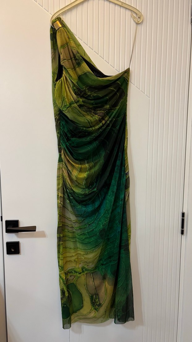 Askısız, dar kesim uzun elbise, straplez yaka ve drapeli silüete sahip. Koyu yeşil batik desenli, ipeksi kumaştan romantik akşamlar için uygun, çağdaş ve avangart tarzda.