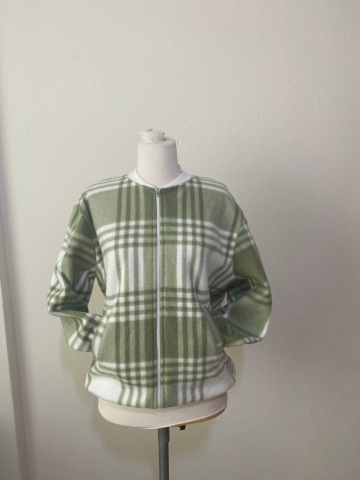 Uzun kollu, yuvarlak yakalı, rahat kesim kadın ceket. Yeşil ve gri ekose desenli, örgü dokulu, ön fermuarlı, midi boyda rahat bir sokak stili sunar.