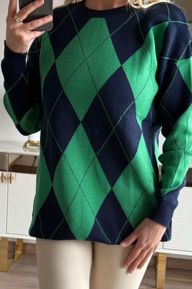 Yuvarlak yaka, uzun kollu ve bol kesim kadın triko kazak. Koyu yeşil-lacivert ekose deseniyle günlük rahat stil için uygundur. Standart beden