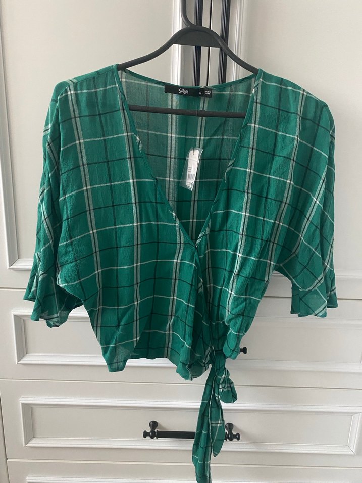 Yeşil ekoseli, düğmeli ve V yakalı bu bluz, salaş kesime ve askılı kollara sahiptir. Belde bağlama detayı vardır, yumuşak dokulu kumaştan üretilmiştir. s-m beden