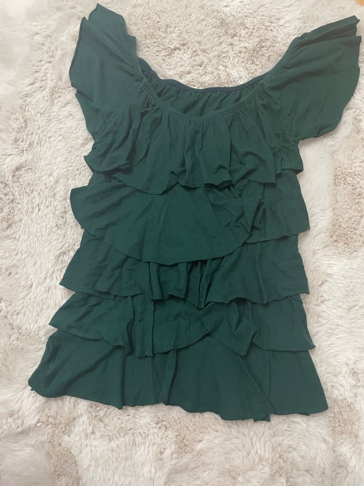 Koyu yeşil renkte, kısa kollu ve kayık yaka bohem bluz. Fırfırlı ve bol kesim olup, sentetik kumaştan yapılmıştır.
