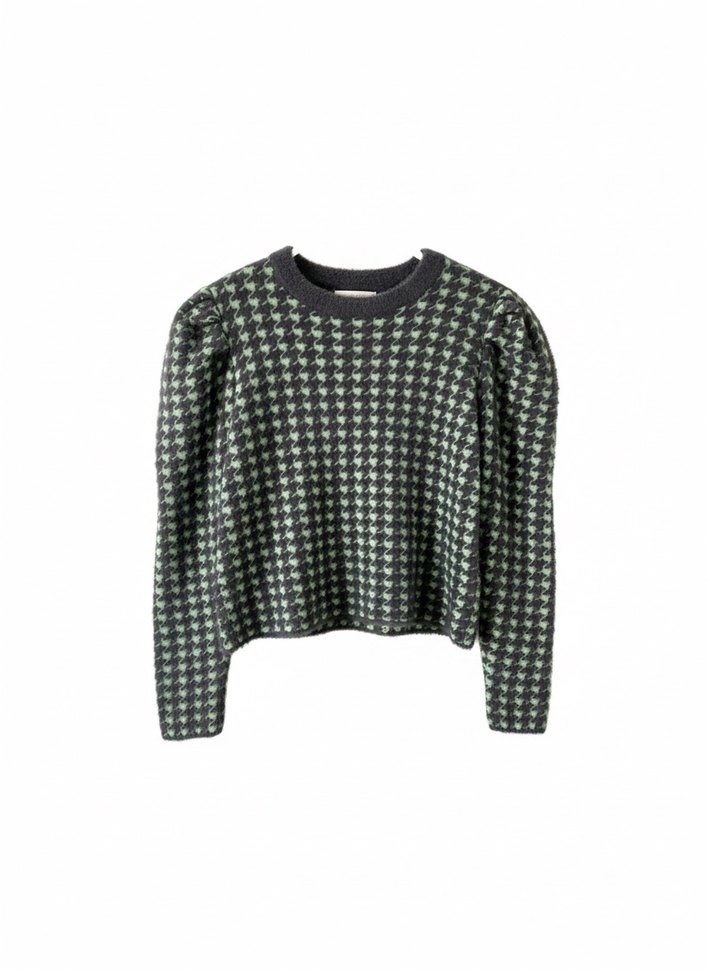 Kadınlar için yeşil ve gri örgü desenli, uzun kollu, yuvarlak yakalı rahat kesim kazak. Sokak stili ve günlük kullanıma uygundur.