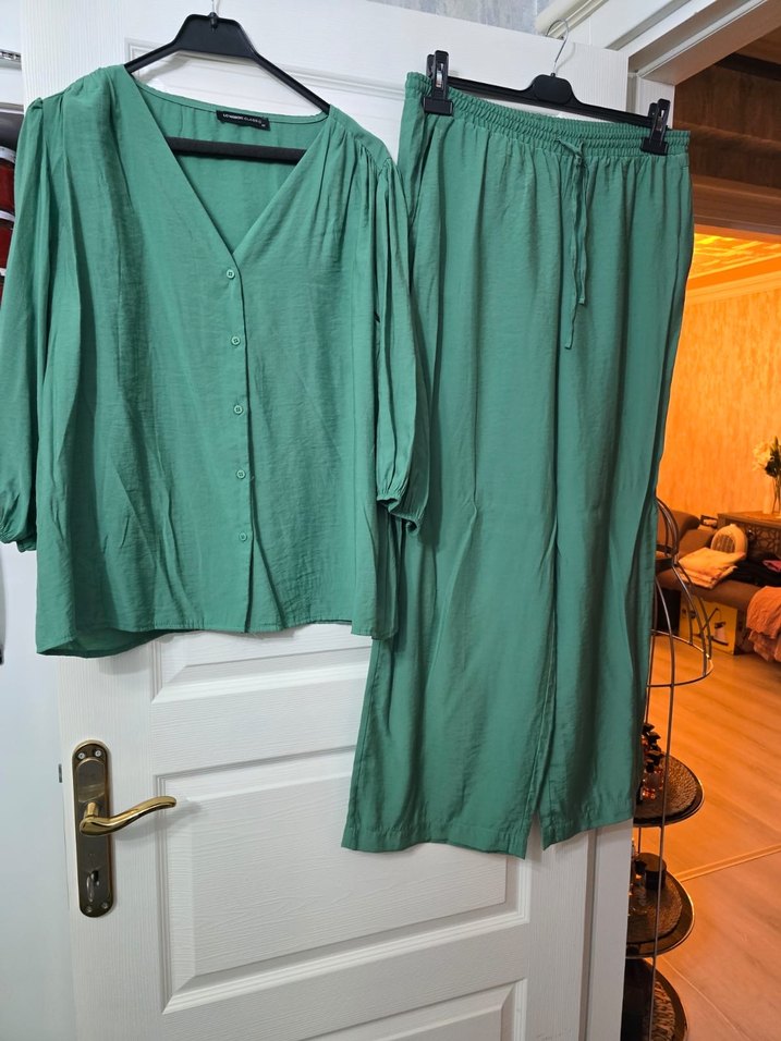 Düğmeli üst ve lastikli beli olan koyu yeşil renkli, bol kesim kadın ikili takım Rahat ve günlük kullanıma uygun.