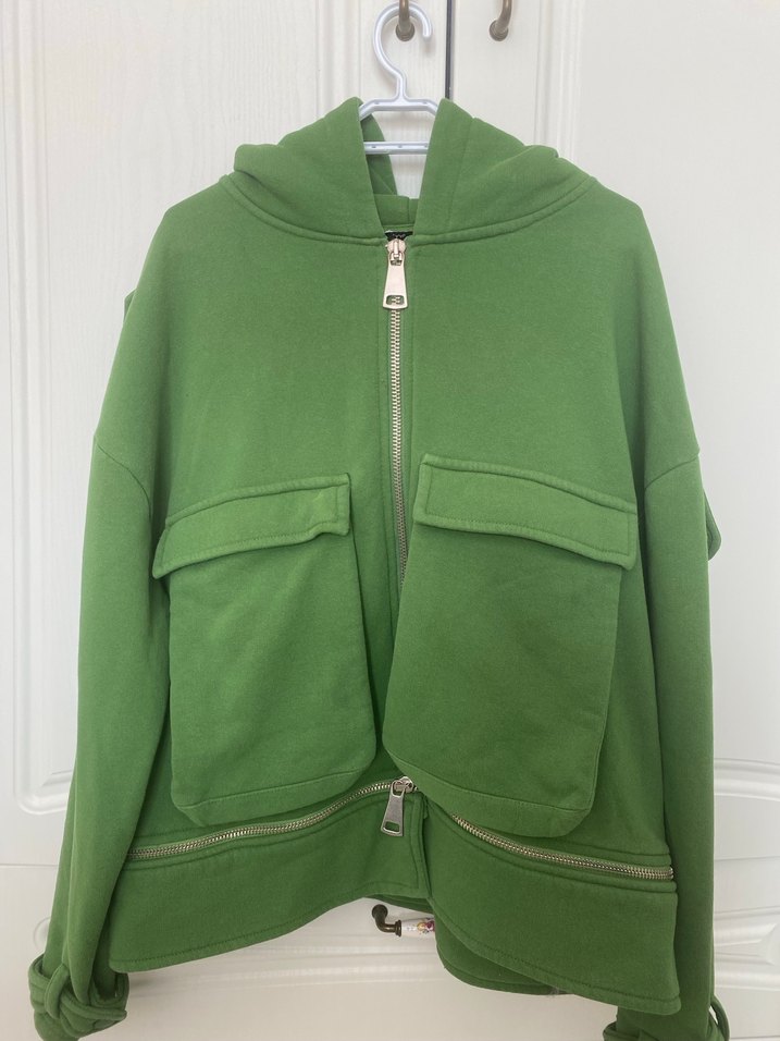 Kadın yeşil kapüşonlu sweatshirt, bol kesim ve uzun kolludur. Yumuşak kumaştan yapılmış, fermuarlı detaylara sahiptir. Günlük kullanıma uygundur.