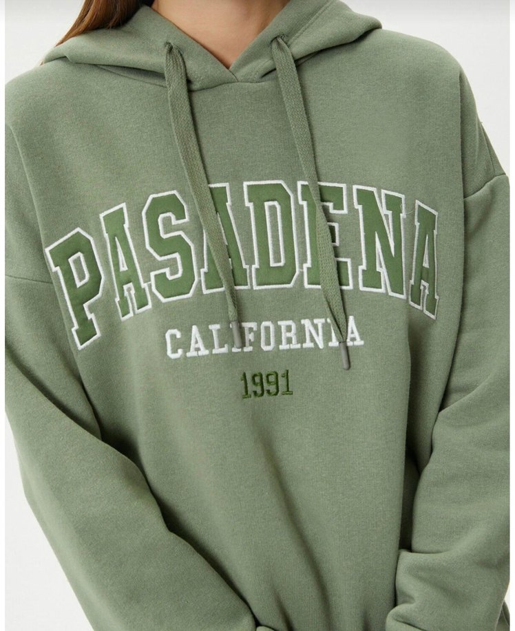 Yumuşak polardan, bol kesim, uzun kollu, kapüşonlu yeşil sweatshirt. Üzerinde 'PASADENA CALIFORNIA 1991' baskısı. Spor tarzına uygun.