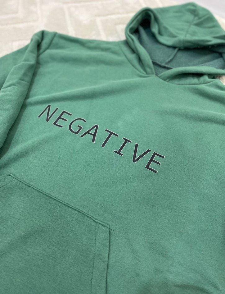 Bol kesim yeşil sweatshirt, uzun kollu ve bisiklet yaka. Üzerinde 'NEGATIVE' baskısı ve fermuarlı detay bulunur. Yumuşak sentetik kumaştan üretilmiştir.