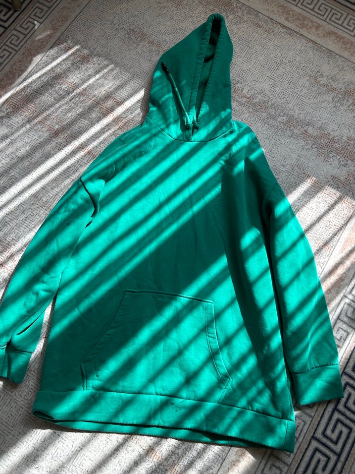 Kadınlar için koyu yeşil kapüşonlu sweatshirt, uzun kollu ve bol kesimdir. Midi boyda ve yumuşak, sıcak kumaştan üretilmiştir, sade tasarımıyla zahmetsiz şıklık sunar.