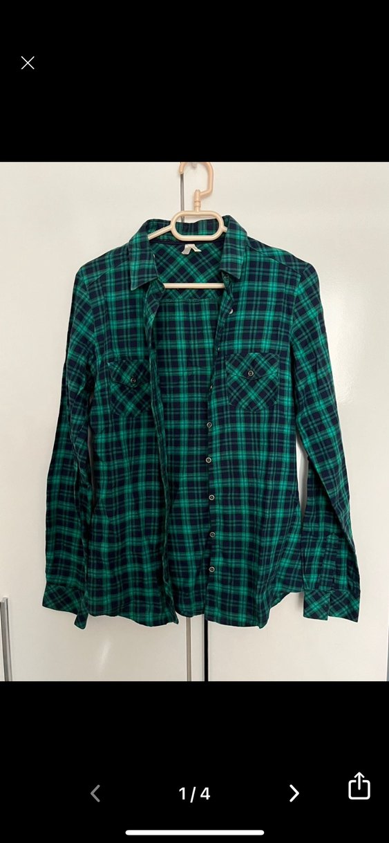 Kadınlar için koyu yeşil kareli, yakalı ve düğmeli pamuklu gömlek. Uzun kollu, bol kesim ve günlük rahat kullanıma uygun.
