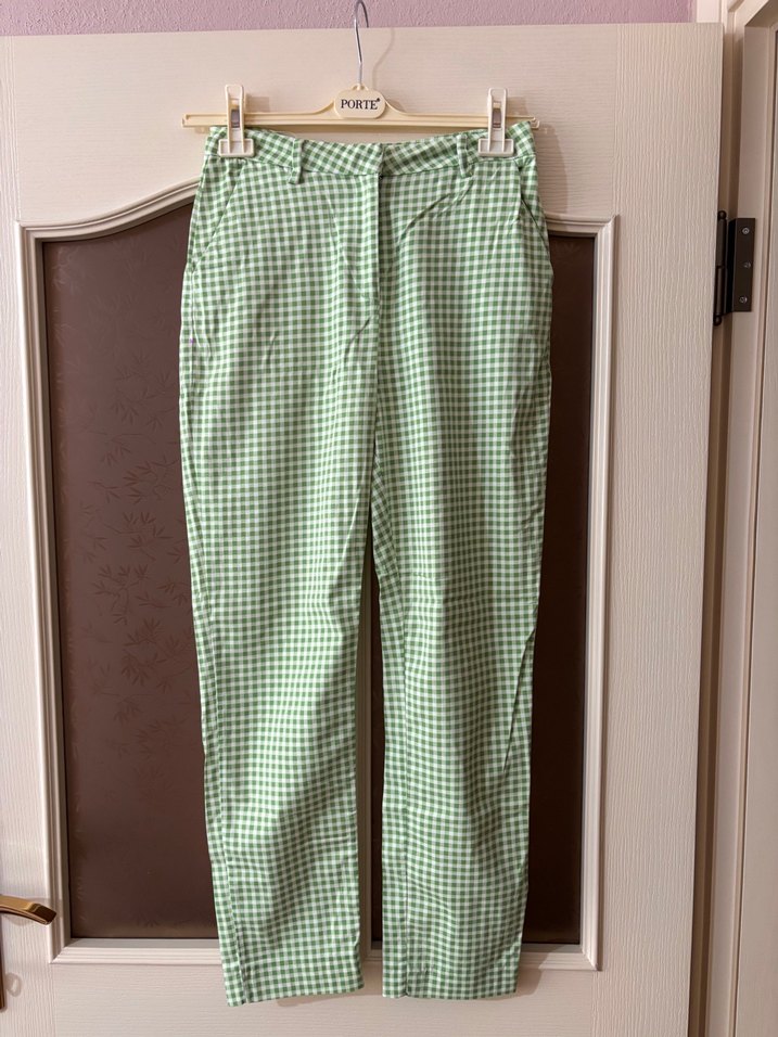 Kadınlar için regular fit ve midi boyda, pastel yeşil kareli pamuklu pantolon. Kemer detaylı, rahat sokak stiline uygun, günlük kullanıma ideal.