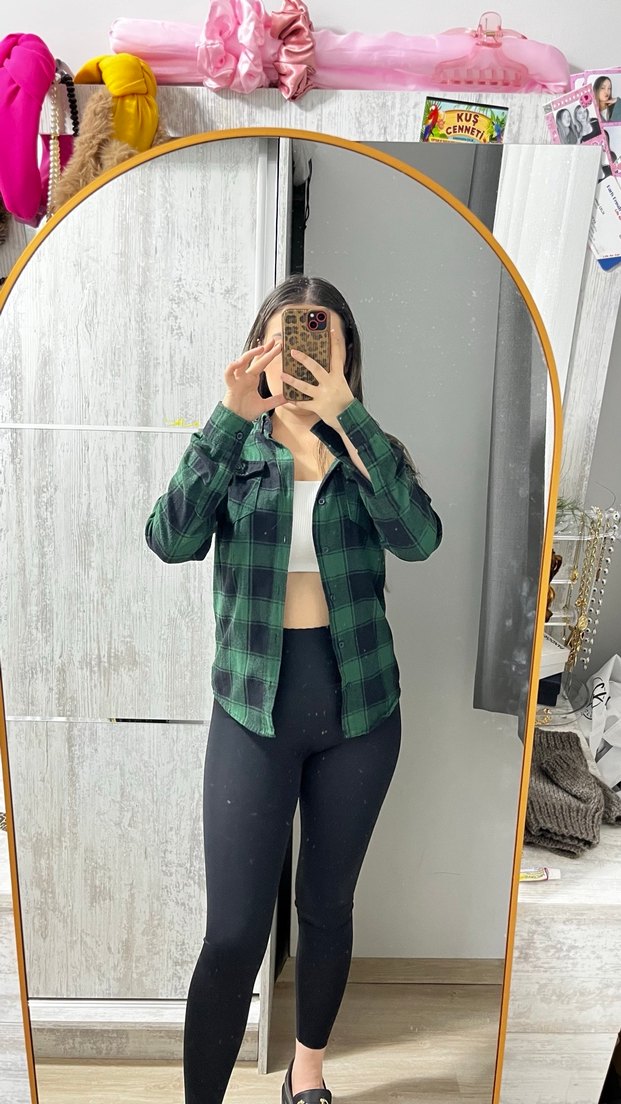 Dar kesim, koyu yeşil kareli uzun kollu kadın gömleği. Yumuşak ve sıcak kumaştan, yüksek yakalı ve hafif transparan detaylıdır. Günlük kullanıma uygundur.