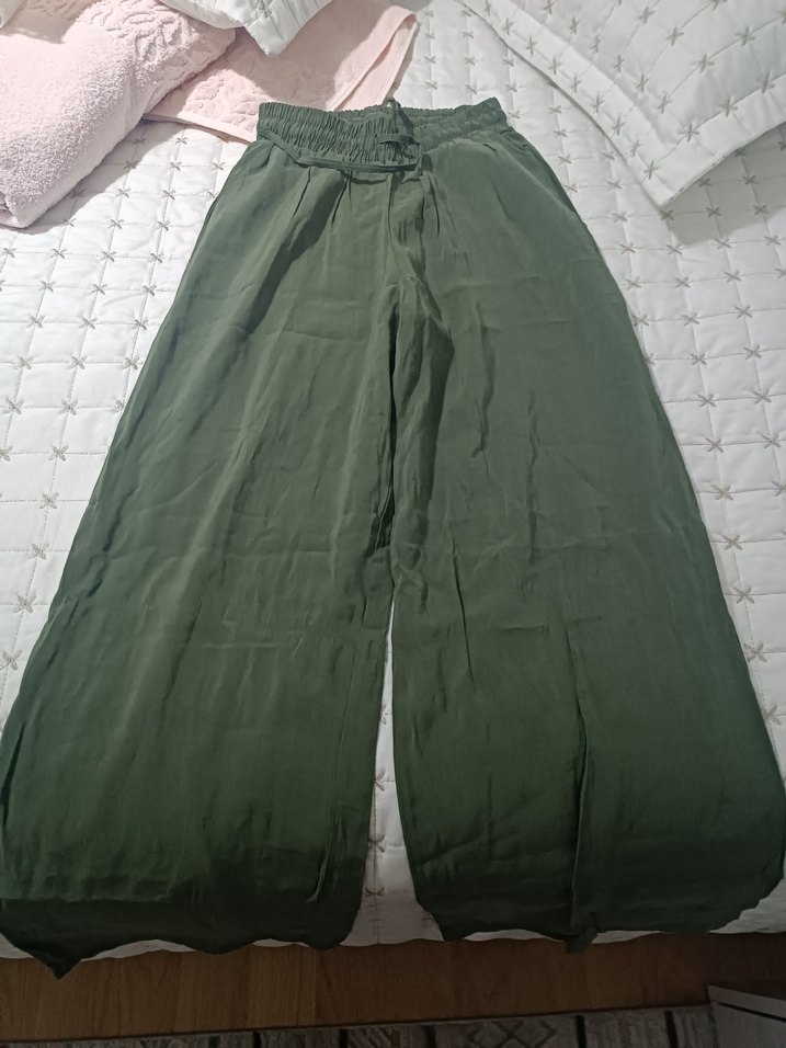 Kadınlar için uzun, bol kesim naylon pantolon. Parlak yeşil renkte, kemerli ve bohem tarzda, rahat dış mekan kullanımı için uygundur.