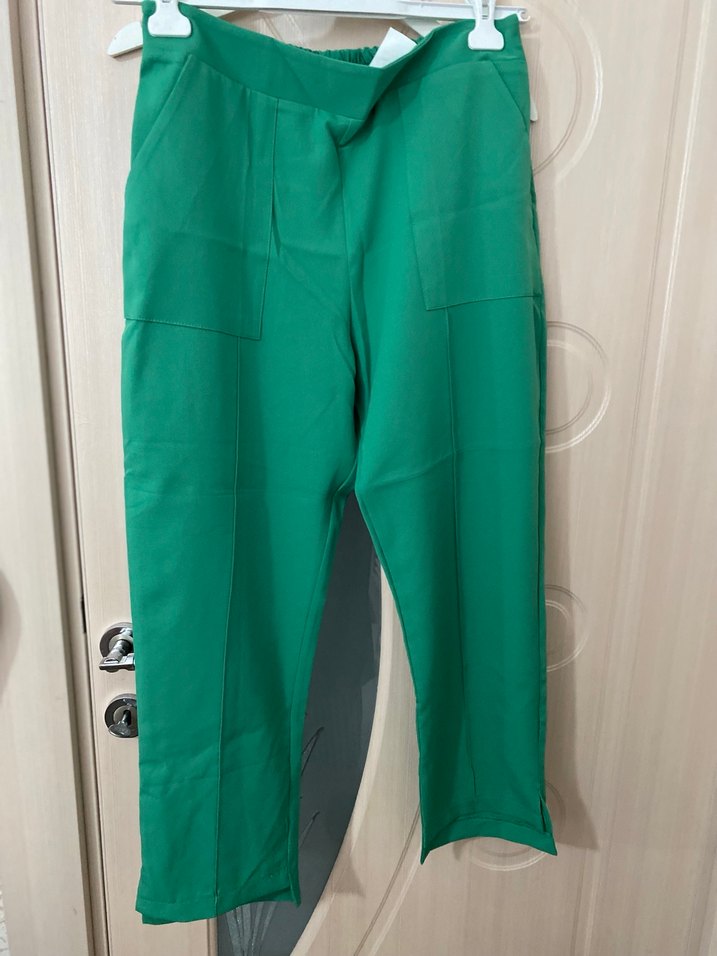 Yeşil renkli, kemerli bel ve midi boyda, parlak sentetik kumaştan üretilmiş kadın pantolonu. Günlük kullanıma uygun rahat kesim ve sokak stilinde.