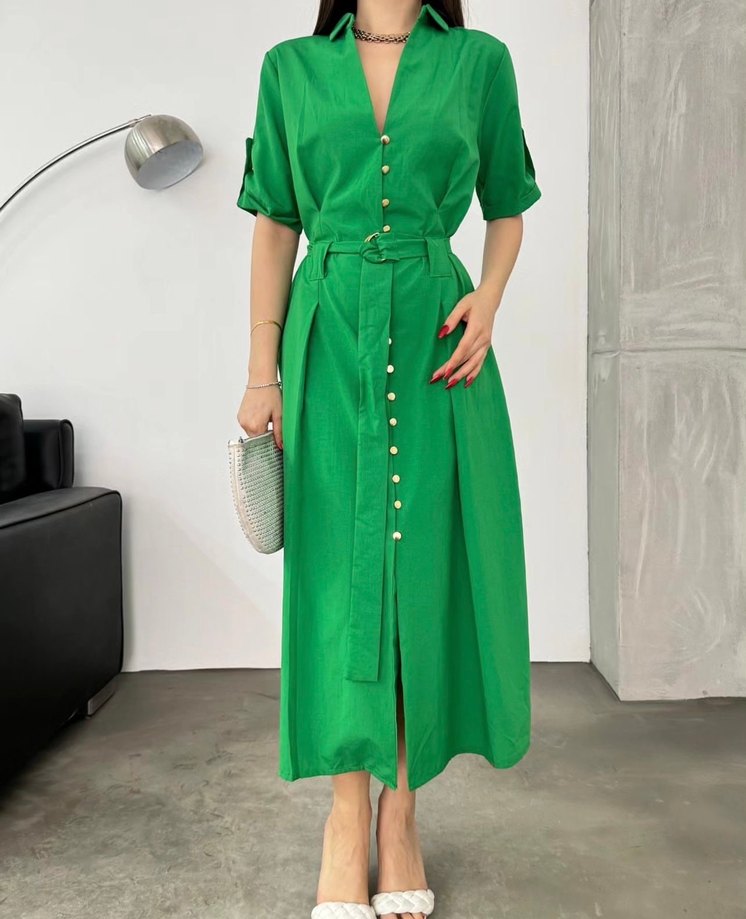 Yeşil, kısa kollu, kemerli uzun elbise. Parlak görünümlü sentetik kumaştan, notched lapel yaka ve rahat kesimle günlük kullanıma uygun bohem tarzda.