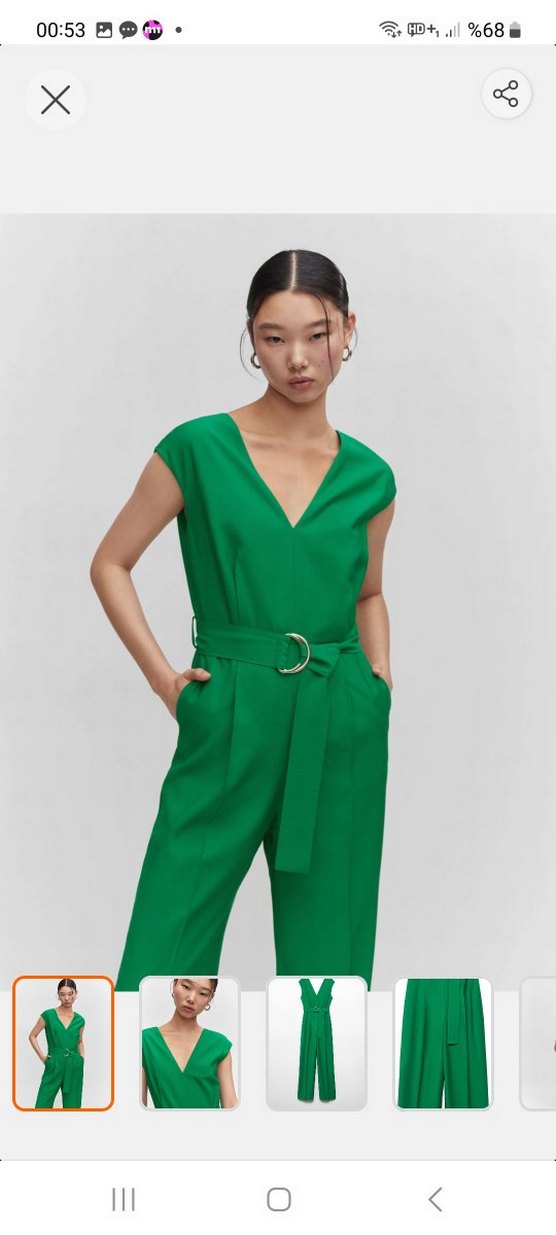 Kadın yeşil tulum, V yaka ve kolsuz tasarıma sahiptir. Kemerli bel, kısa boy ve parlak dokusu ile ofis kullanımı için uygundur. sifir.hic kullanılmadı s beden yakasi ve koltuk altı tadilatla kapatıldı ölçülerini ve kendi gorsellerini yükleyeceğim iki kol arasi 44 cm omuzdan boy 143 cm xs s bedene uyumlu