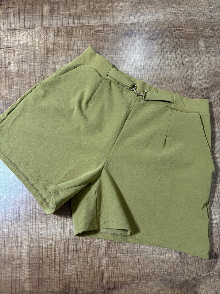 Kadınlar için yüksek bel, kemerli ve bol kesim mini şort. Yumuşak sentetik kumaştan, pastel yeşil renkte, günlük kullanıma uygun rahat bir sokak stili sunar.