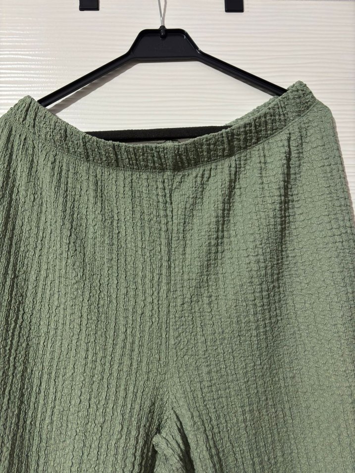 Yumuşak keten kumaştan yapılmış, bol kesim yeşil kadın pantolonu. Pilili ve uzun boylu, rahat günlük kullanım için uygundur.