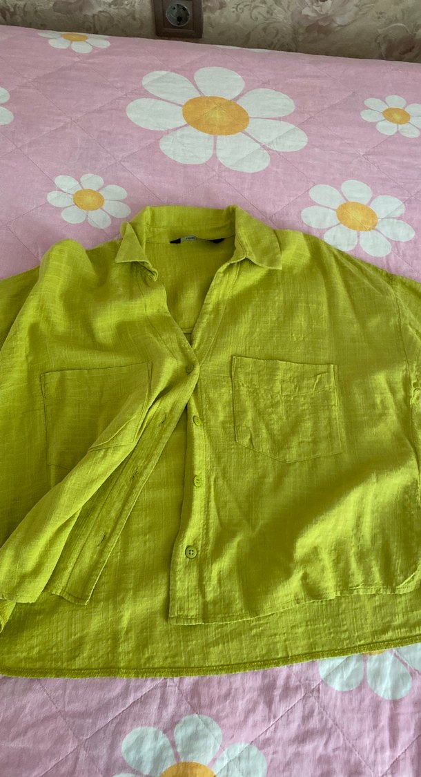 Pastel yeşil keten kumaştan, düğmeli, uzun kollu, yakalı ve cep detaylı bol kesim kadın gömlek. Rahat ve gündelik kullanıma uygun.