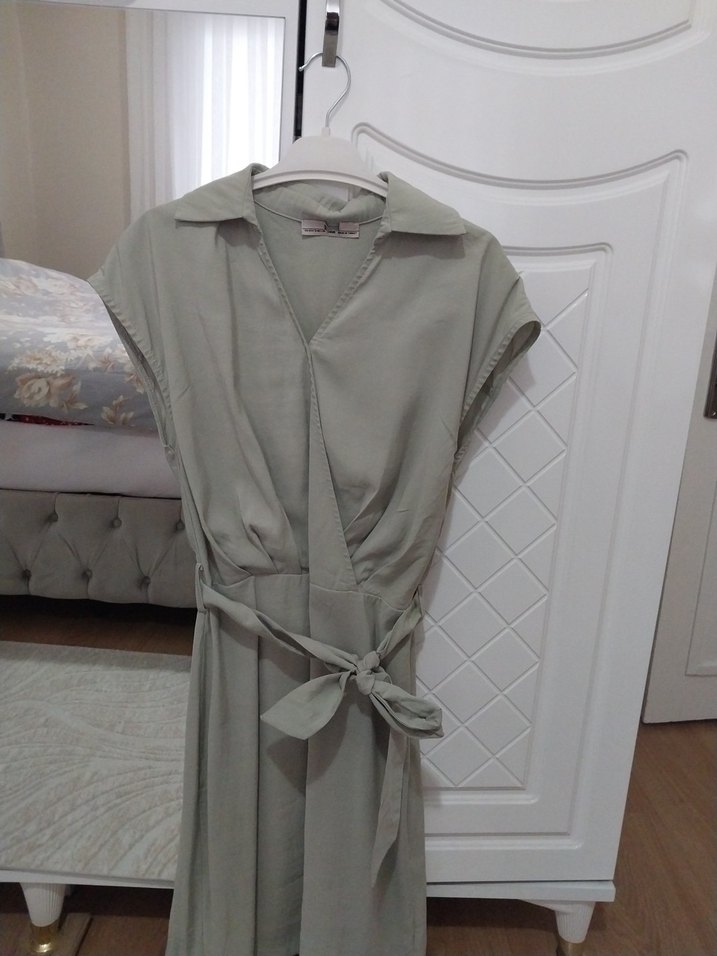 Kadın yeşil Keten Kemerli Uzun Elbise