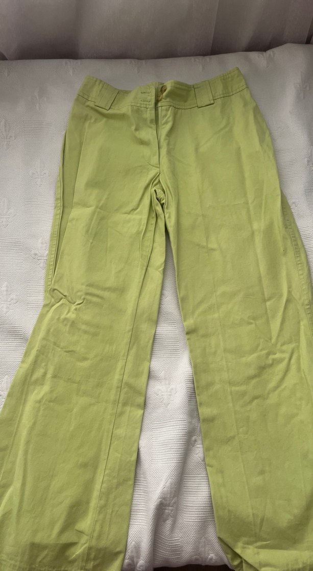 Yeşil keten midi pantolon, rahat kesimi ve pastel tonu ile günlük kullanıma uygun, casual normcore tarzında.
