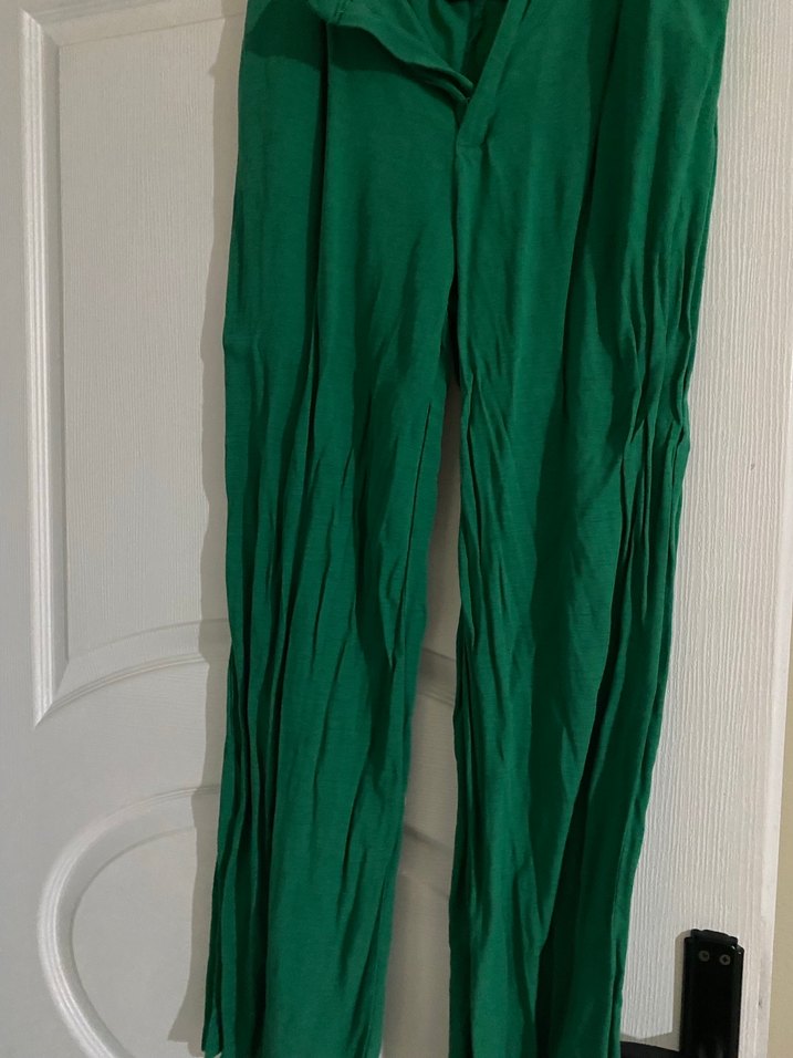 Yeşil uzun keten kumaştan, pilili ve bol kesim kadın pantolon. Günlük kullanıma uygun, modaya uygun ve normcore tarzda.