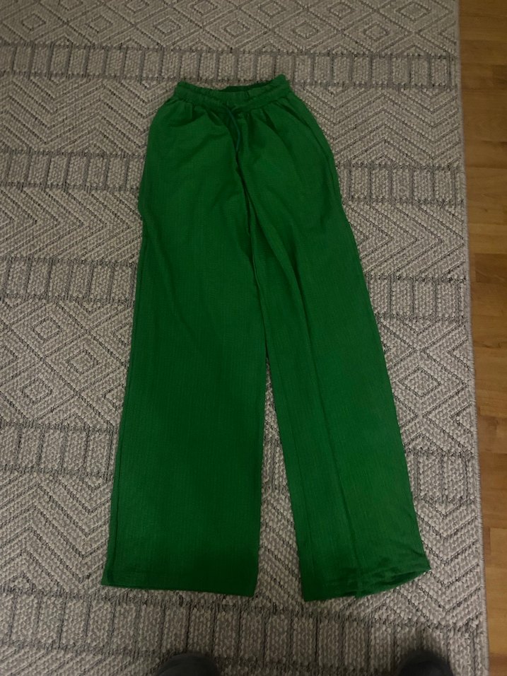 Yeşil keten, pilili, midi boy, bol kesim kadın pantolon. Günlük rahat ve şık sokak stili için uygundur.